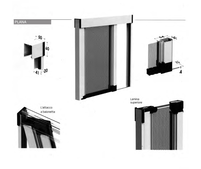 Plana – Zanzariera modulare a scorrimento laterale con guida inferiore bassa e senza bottoncini.